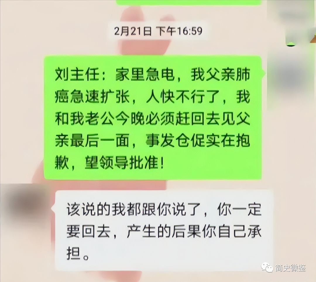 刘女士的母亲打电话来说,医院已经下了最后的通告,你们赶快回来送你爸最后一程吧。作为一个合格的打工人,刘女士自然对公司的规章制度烂熟于心。但另一边自己的父亲已经没有多少时间了。再次去请假再次被拒后,刘女士知道走正常流程已经来不及,她只好给自己的上级领导发了信息,希望领导能够理解自己的情况。但让刘女士没有想到的是,自己掏心掏肺的请求并没有得到批准。