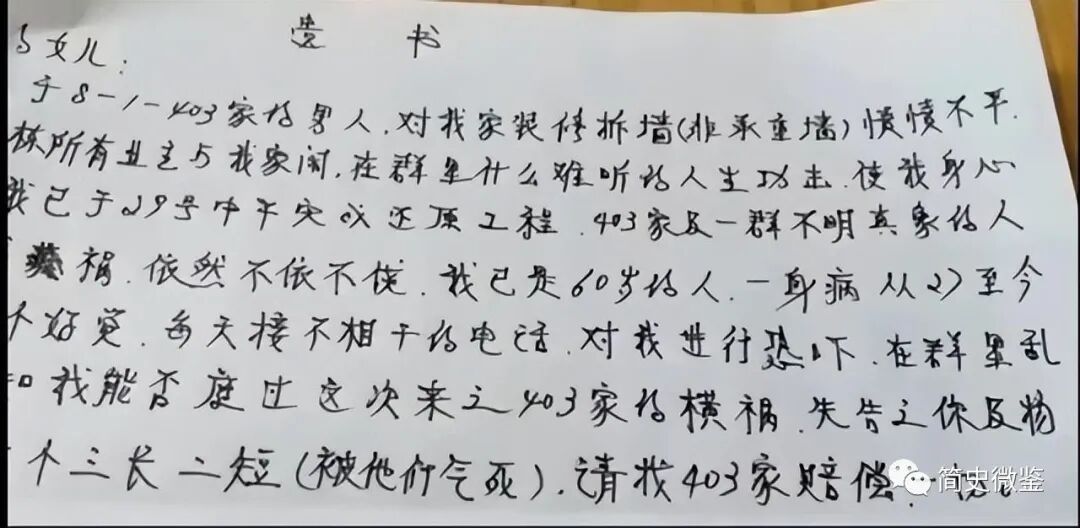 到了晚上,楼里时不时地会传出一阵奇怪的响声,第二天一大早,韩大妈就被一阵强烈的砸门声惊醒,通过猫眼一看,自己家的门口已经被堵了个水泄不通。他们要干什么?真要逼死自己?韩大妈越想越气,她要想点办法治一治这群“恶邻”。韩大妈来到书桌前面愤然立下遗嘱,上面赫然写到“如果我有什么三长两短,就是被他们气死的”。