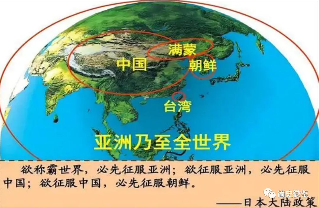 所谓大陆政策,就是日本人提出称霸世界的五个步骤:第一个步骤是占领台湾,以此地为前沿阵地,当时的他们有了琉球群岛,台湾被他们视为囊中之物;随后则要侵占朝鲜半岛,作为进攻满蒙的跳板;然后从朝鲜侵占满蒙,动摇清朝统治的根基;满蒙南下占领中国;占领地大物博的中国,则能雄狮亚欧大陆,实现称霸之梦!