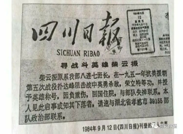 1984年9月12日,一个开拖拉机的农民小伙在加油站加油时顺手拿起了加油站里的《四川日报》开始阅读,随心读报的他却被一则消息吸引了目光,在报纸的第四版上有一则寻人启示,而启示的标题是《寻找战斗英雄柴云振》,而它的内容是这样的: