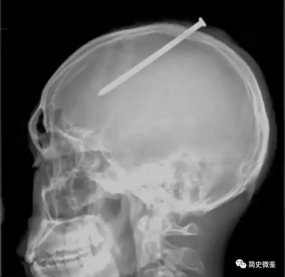 哥哥是乡村医生,当即把弟弟送到了大医院检查,而检查结果把两人吓了一跳:在小陈的脑袋里,插着一颗10厘米左右的钉子!