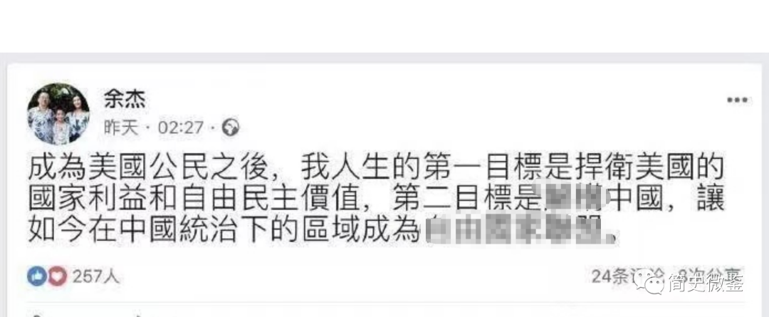 余杰这条推特是这样说的:“成为美国公民之后,我的人生第一目标是捍卫美国的利益和价值!”