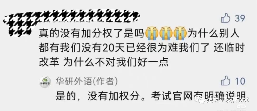 提问:我想问问这个是真的吗,小红书全是关于这个,还有官网也这么说。今年专四是不加权了吗?