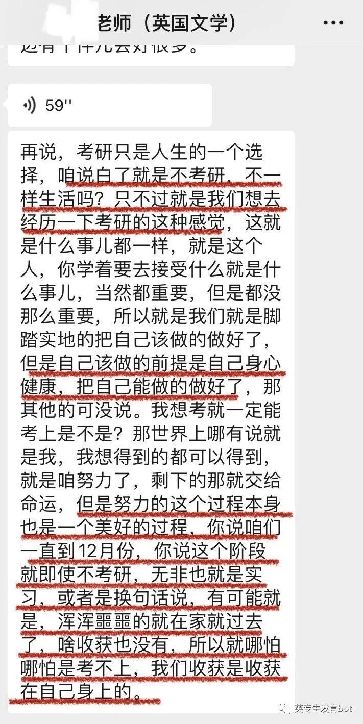 分享:看到今晚有英专生 suicide 的投稿,想到了前些天论文选题时给导师说了一嘴“最近学习遇到瓶颈,开题报告可能要晚点交”。虽然我只上过这位老师两学期的文学课,但是老师给我发来了很长很长的语音。真想不到第一个告诉我“考不上研究生也没关系的人”竟然是我的老师,在很大程度上缓解了我当时的焦虑,我转成了文字,bot可以审核一下看看有没有发出的必要,如果可以安慰到大家我很开心。
