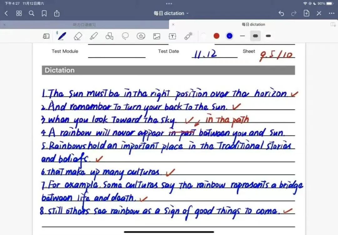 @漫游星球幻想家:我老师说过,听写是一段话,要像写作那样连起来写,而且标点符号也是算分的,不要写序号和斜杆。你也可以问问你们老师。