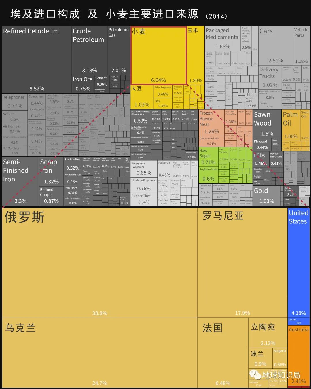 距离乌克兰2400千米的埃及,是小麦进口量最大的国家,也是西亚北非国家依赖东欧粮食的缩影。近年来埃及进口小麦中的6至8成来自俄罗斯,1至3成来自乌克兰,两者加总将占据绝对比例。