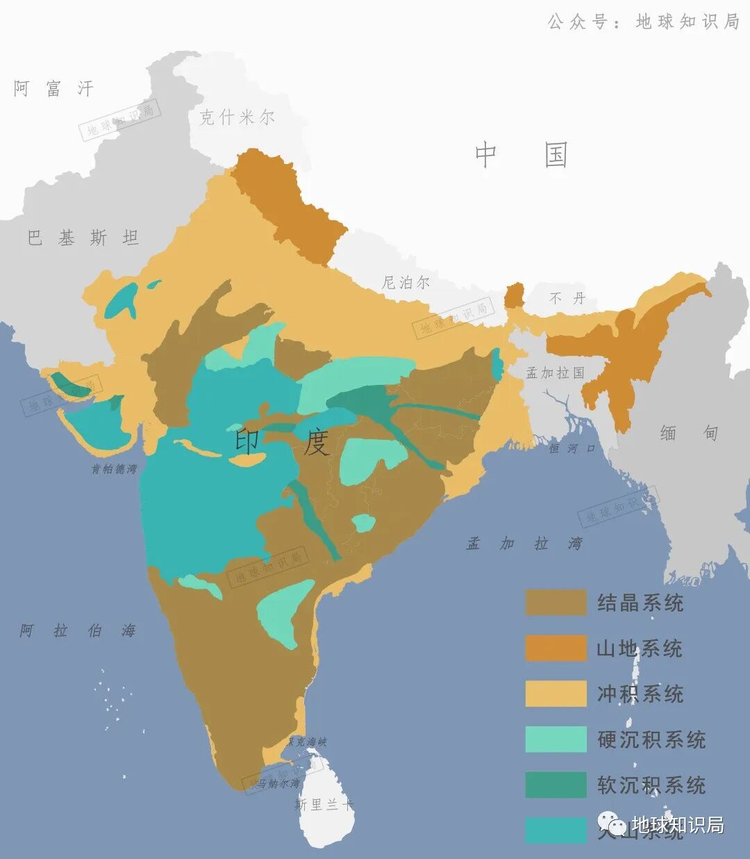 此外,还有喜马拉雅地区的山地系统、印度中部地区旱地中的软沉积系统和硬沉积系统、西部地区火山系统等不同地质环境中的地下含水层类型,这些地下水异质性很强。
