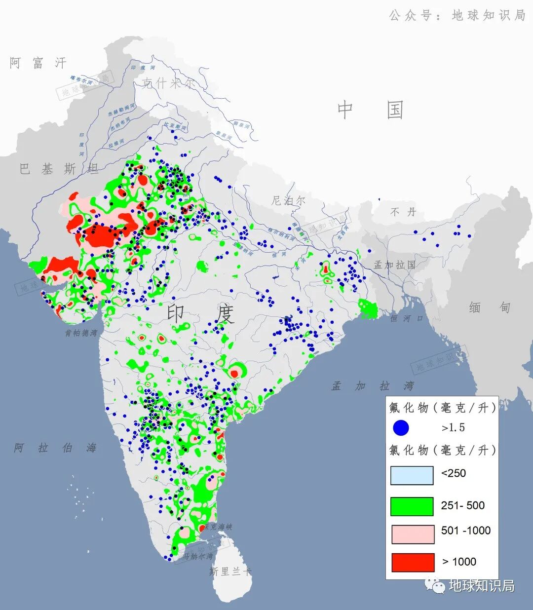 (印度地下水氟与氯污染分布 参考:CGWB)▼