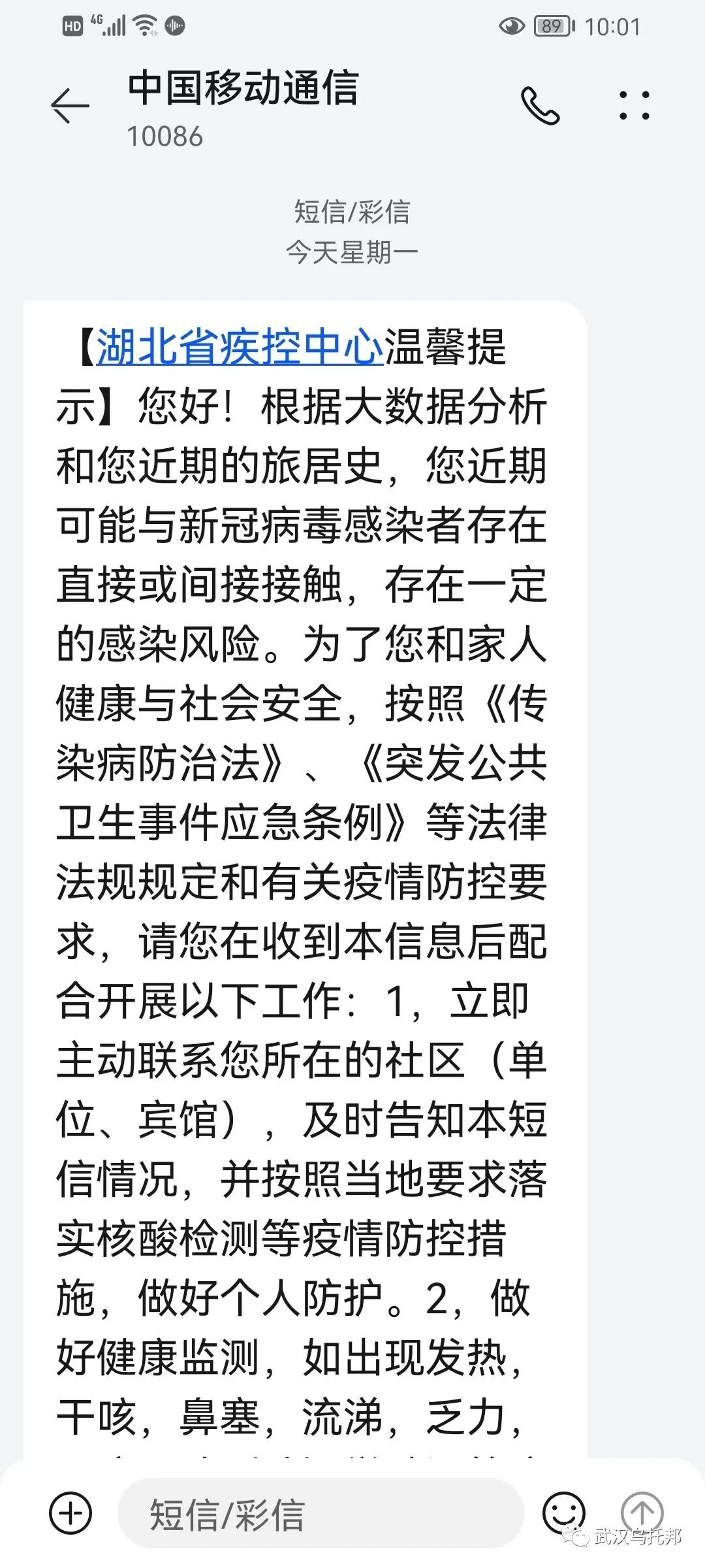 短信里面也做了提示:做好健康监测,如出现发热,干咳,鼻塞,流涕,乏力,咽痛、嗅(味)觉减退等症状,要及时到当地定点医疗机构就诊,并告知医生本短信情况。就医途中请做好个人防护,不乘坐公共交通工具。如未履行疫情防控义务造成传染病传播扩散,将承担相应的法律责任。感谢您的理解和支持!