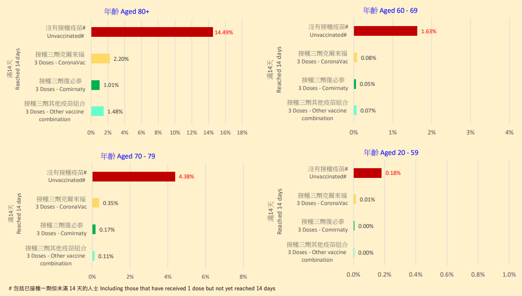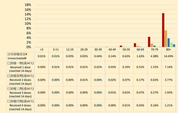 3、未接种或只接种一剂疫苗人士感染后的死亡率比已接种两或三剂者高超过10倍