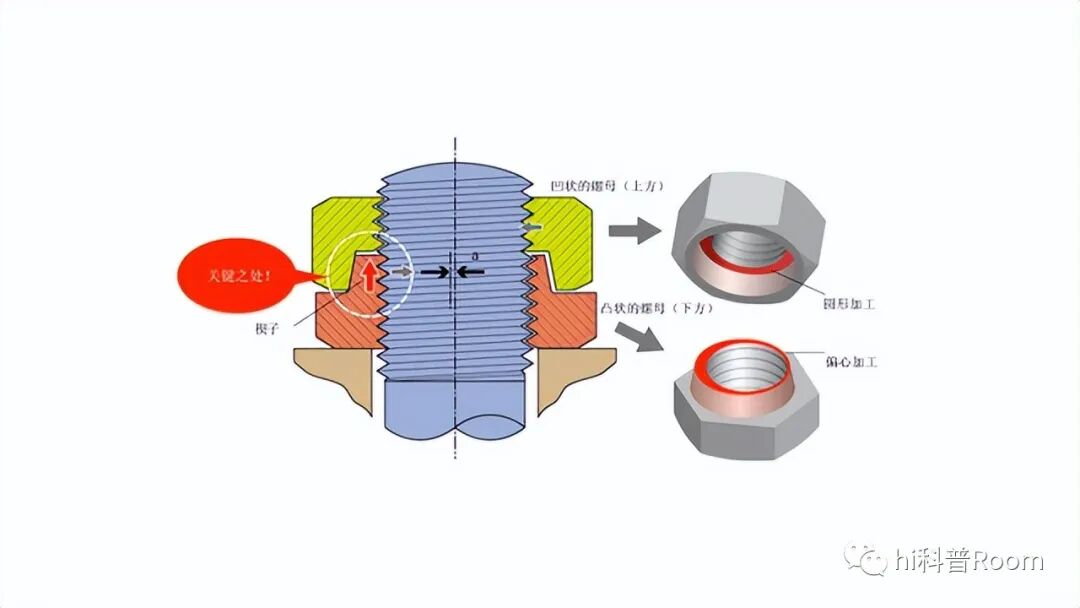 我们为什么能够做出同样出色的产品?很重要的原因就是不盲从哈德洛克螺母所包含的技术确实不同凡响,但如果盲目跟随这样的技术路线,很难造出同样性能的产品。首先来了解一下哈德洛克螺母原理。哈德洛克螺母包含凸螺母和凹螺母,使用时先将凸螺母旋进螺栓,然后将凹螺母旋进,并且凹凸面配合在一起。它的巧妙之处就在凸螺母上,从图中可以看出凸螺母边缘是厚薄不均的,形成了类似门楔的结构,像门被门楔卡住一样,凹螺母能被凸螺母牢牢地锁在螺栓上。