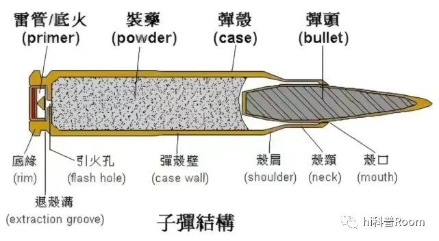 一颗子弹主要由子弹头、子弹壳、发射药、底火四个部分组合而成。