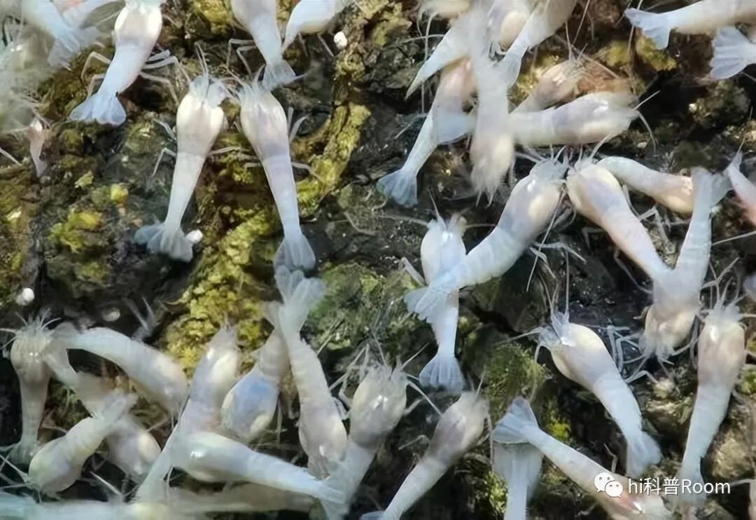 除了庞贝蠕虫外,不知道大家有没有听说过一种叫“超级耐热虾”的虾类?“超级耐热虾”实际上叫“白色盲虾”,是英国科学研究小组在加勒比海开曼群岛以南一处海沟发现的一种虾类。因为生活在海底的缘故,它的眼睛严重褪化,身体透明,背部可以发光,它们一般通过“背部的眼睛”来感受与火山口的距离远近。