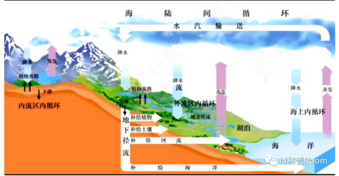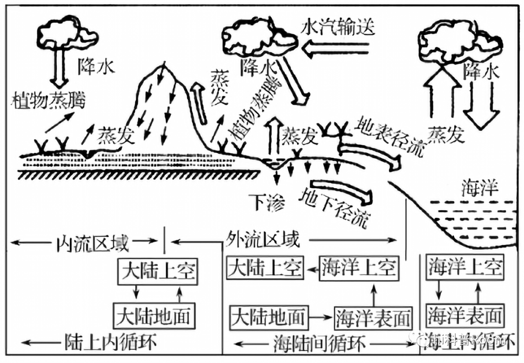 水循环还可以通过空间来分为海上内循环、海陆间循环、陆地内循环,当降水发生后,雨水落在地表和海中,可直接参与蒸发,水分蒸发上升到高空后。