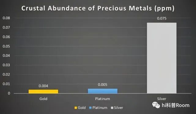 在地球的地壳元素丰度的测量单位是每百万之一(ppm)。三种贵重金属(金、银、铂),黄金是最稀有的(0.004 ppm),其次是白金 (0.005 ppm),最后是银 (0.075 ppm)。