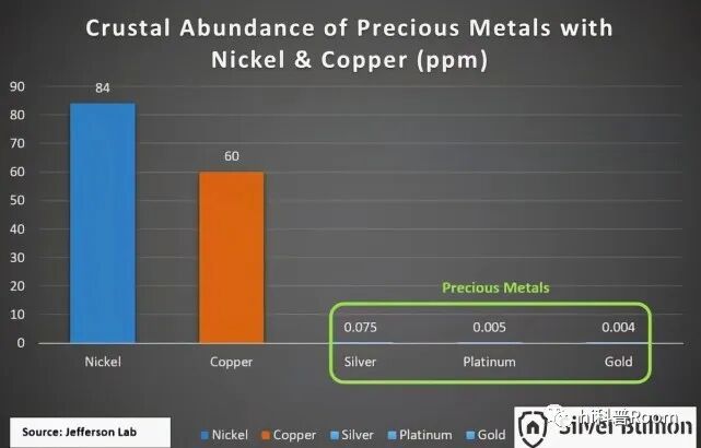 我们再来对比下地壳下的贵金属和铜、镍的含量,可以看出在对比之下,贵金属的含量就变得微不足道了。这也就不难解释为何这些贵金属的价格如此昂贵了。