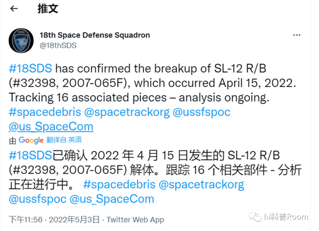 此次爆炸的火箭编号为#32398,2007-065F,它是2007年护送俄罗斯卫星(格洛纳斯)进入轨道的一个运载火箭。格洛纳斯系统每颗卫星都在19100千米的高空中,所以末级火箭脱离之后并未坠入大气层烧毁。