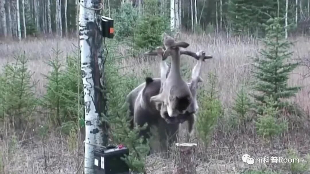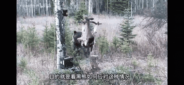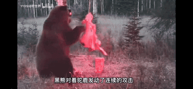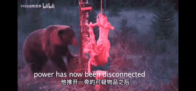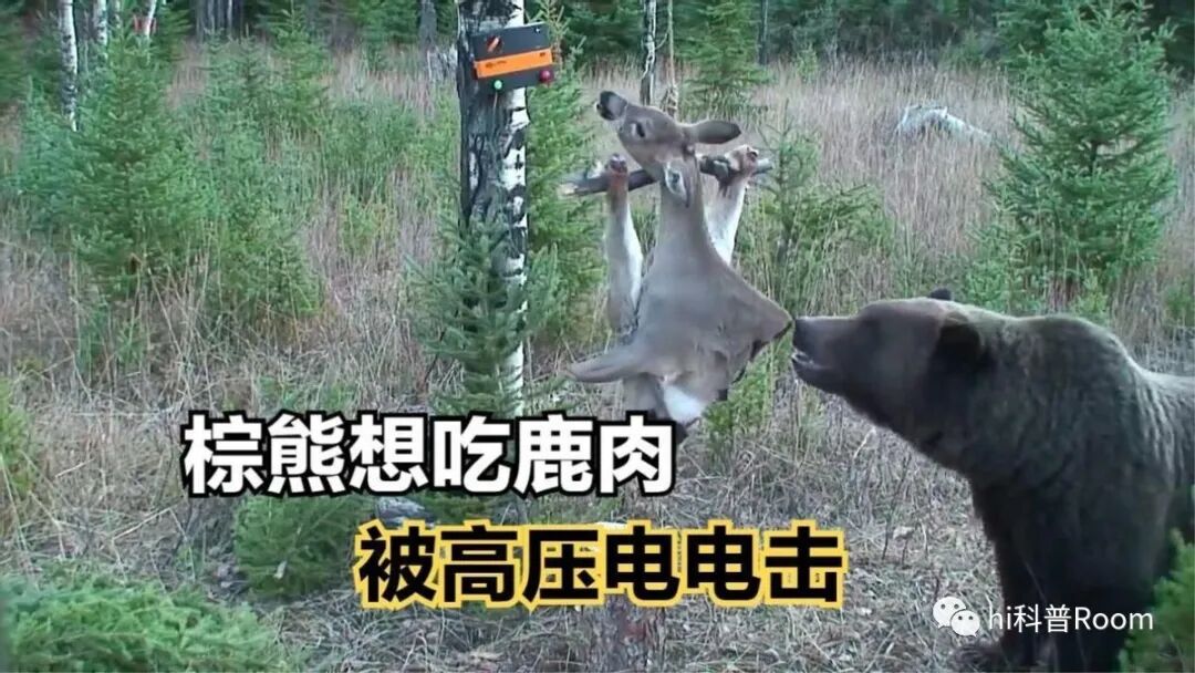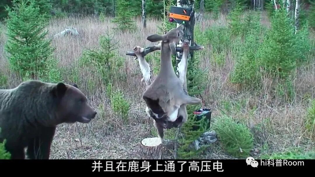 这头棕熊在刚看到小鹿的时候,眼冒金光,嘴角流下的口水透露出它的兴奋。眼见它直接站起来用嘴咬住头顶的小鹿,然而,电流窜进嘴巴的酸爽还是让它不得已暂时放弃到嘴的美味,并且一下子把它吓得跑进了森林。原本实验人员以为它再也不会回来了,但兴许是美食的诱惑实在太大,它终究还是回到了那棵树下。