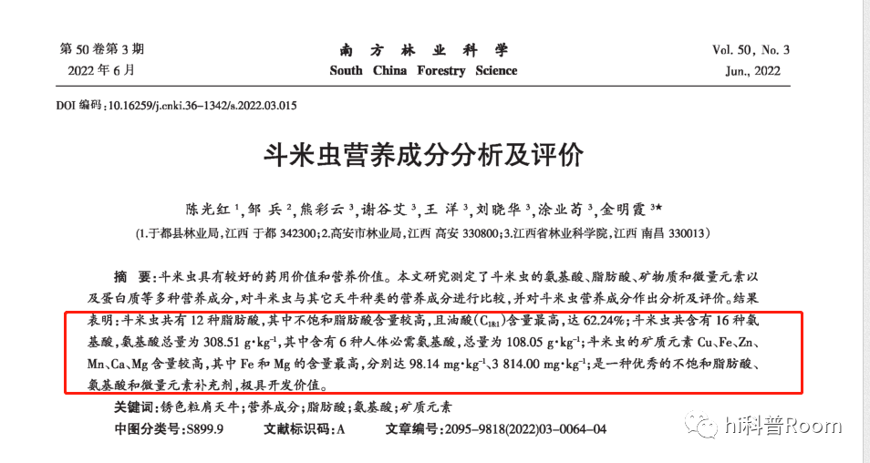 另外,根据现代的研究,斗米虫对于调节人体免疫低下的确是有一定效果的,于都县林业局、高安市林业局和江西省林业科学院还曾研究过斗米虫的营养成分,发现斗米虫含有16种氨基酸,其中有6种是人体必须的氨基酸,总量为108.05g/kg。 而且斗米虫里铜、铁、锌、锰、钙、镁的含量都比较高,尤其是铁和镁,更是分别达到了98.14mg/kg和3814mg/kg。它还含有12种脂肪酸,其中油酸的含量最高,达到了62.24%。可以说斗米虫是非常优秀的氨基酸、微量元素和不饱和脂肪酸补充剂。