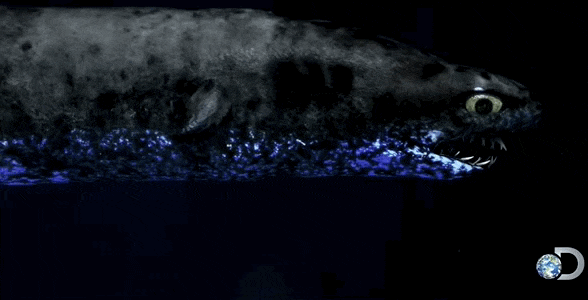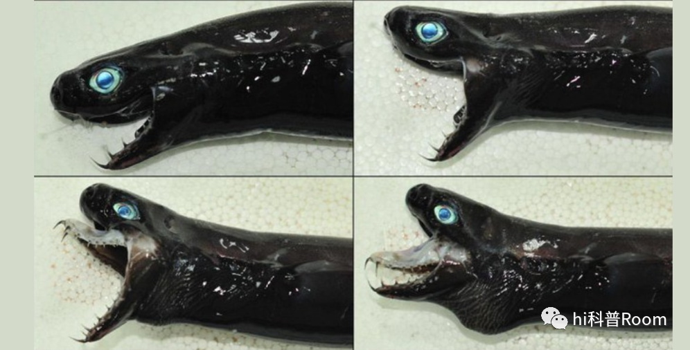 它的身体呈圆筒形,黑色,特征是蓝色弹珠般的眼睛和像鱼钩一样尖的牙齿,腹部有无数深海生物常见的发光器。目前相关研究人员只在日本、台湾和夏威夷的沿岸发现过鳄鱼嘴鲨。白天,由于它们生活在水深300 ~ 500米的深海中,所以几乎没有被人类发现过,但是到了晚上,它们会上升到水深150米附近。2.简直就像外星人的嘴一样根据调查,鳄鱼鲨会张大嘴巴,去掉自己的上颚,然后向前突出捕食猎物。根据研究人员的说法,鳄鱼鲨会用腹部的发光器来吸引细小的猎物,当猎物接近嘴边时,会飞出下颚来捕食。