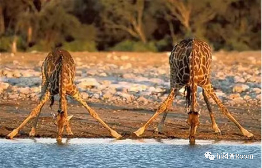 长颈鹿长脖子长腿的特征给她们获取食物提供了巨大的便利,但有的时候也会有些许的不方便,就比如,长颈鹿需要喝水的时候就比较困难了,它们需要把前腿以最大的角度劈叉开的同时,为了能让长脖子能伸下来和保持脖子的平衡性,后腿也要尽力分开,然后再慢慢把脖子伸到水里饮水。长颈鹿这种劈叉喝水的方式也算创造了生物饮水史上前无古人后无来者的先例了。