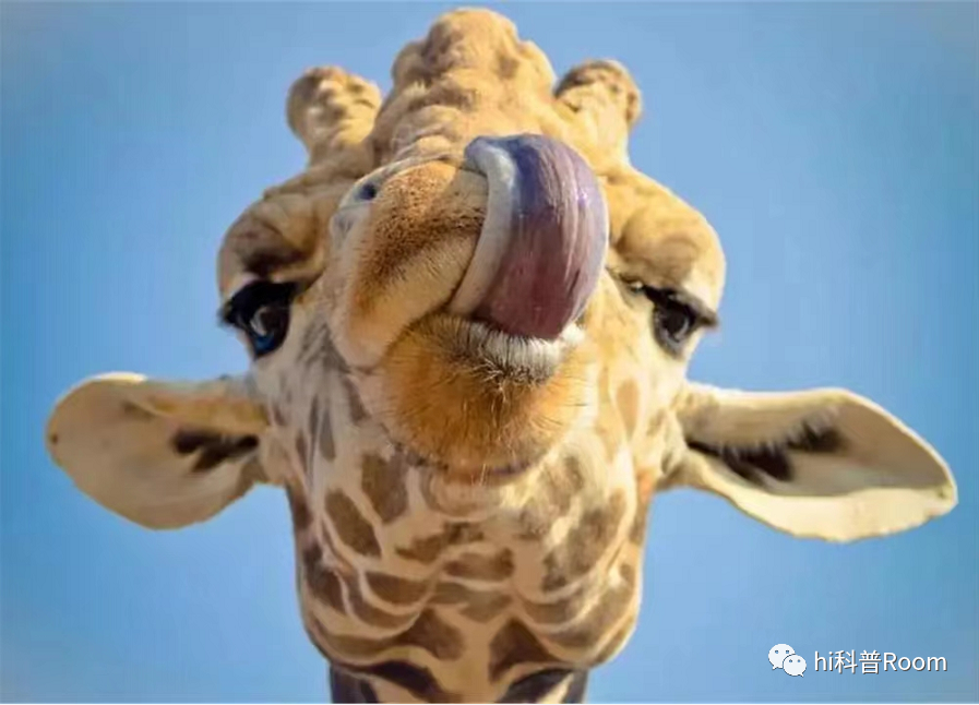 而且长颈鹿最神奇的是拥有将近半米长的舌头,它的舌头的颜色特别的奇特,舌头的前半段是深紫色的,后半段才是正常粉嫩的肉色,据说这是因为在非洲热带地区,紫外线太强,而长颈鹿又需要长时间伸舌头获取大量的食物,所以为了防止舌头被紫外线晒伤才会呈现这样的颜色。