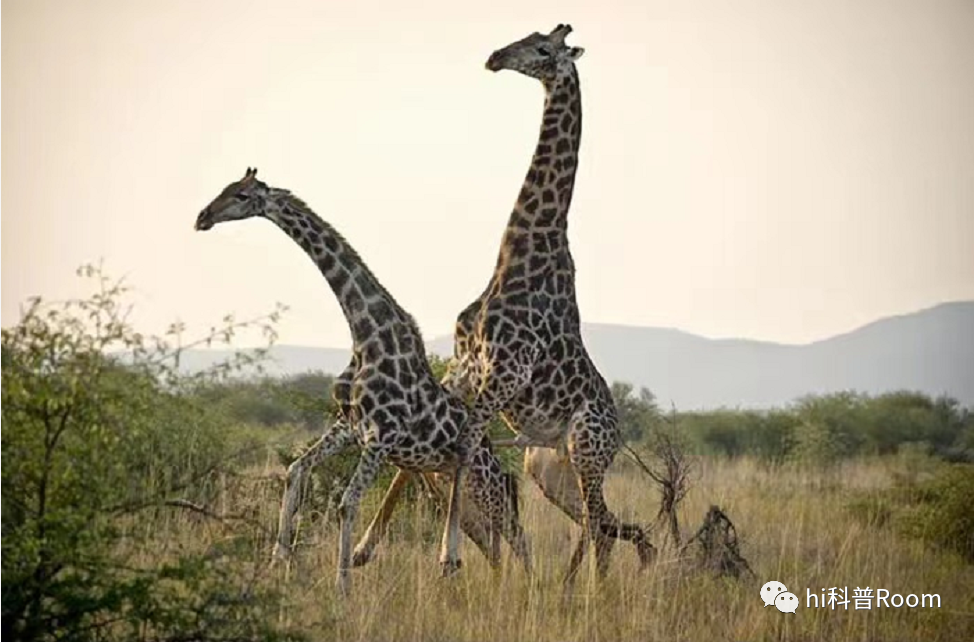 而其他的树木大都是以伞型为主的高大型植被,树叶多集中在上层,特别是长颈鹿喜爱吃的金合欢树的树叶也越长越靠上。所以为了获取食物,长颈鹿们只能不断的伸长脖子去够着头吃树上的叶子,慢慢的它们的腿和脖子就演化得越来越长。