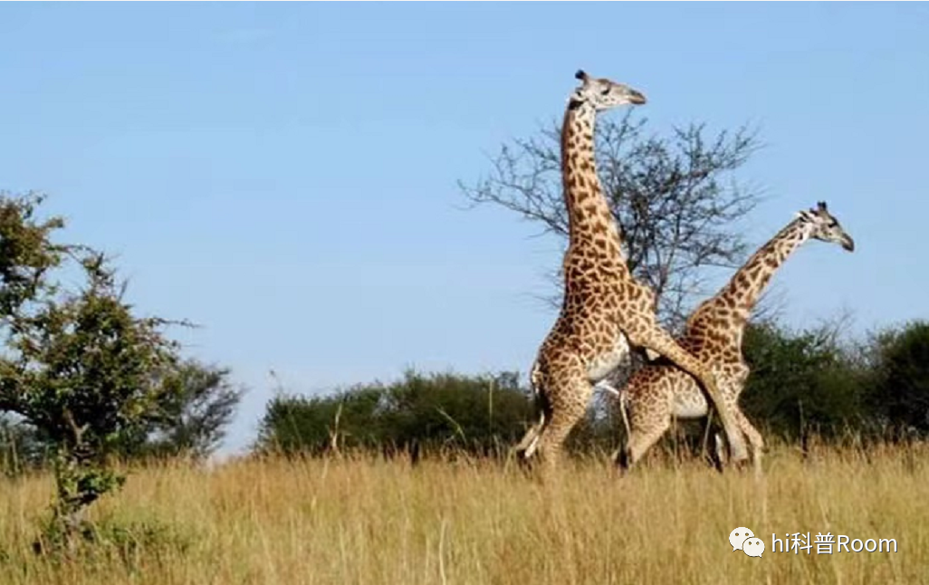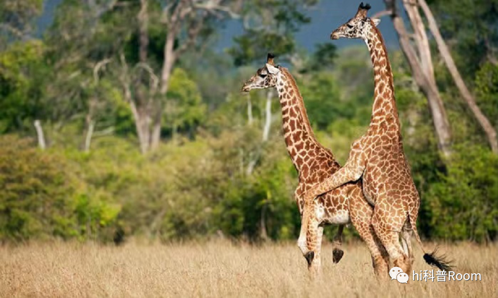 最后等到一切准备就绪以后,雄性长颈鹿为了能确定雌性长颈鹿是否在发情,它们一般都会紧跟在雌鹿后面,然后会用头紧紧贴着雌鹿的臀部。