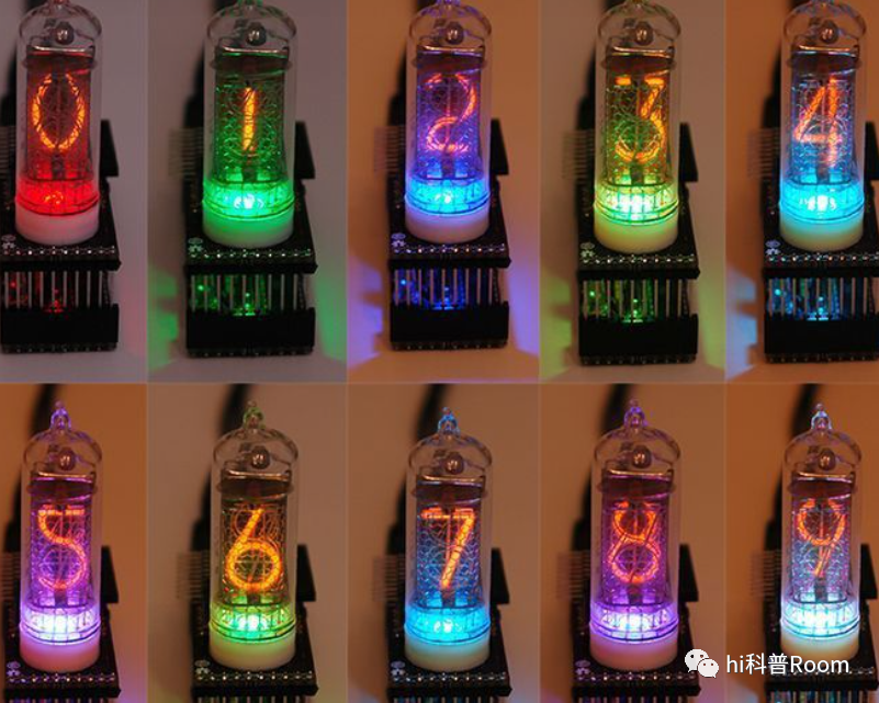在当时,可以选择的款式还不止是数字,还可以定制化选择不同的图案和字母,因为发光的阴极铁丝是可以人工调整的。而且还可以选择不同的颜色,因为发光的颜色是由稀有气体来决定的,可以在管内通入惰性气体氖气和汞或氩,这样每一个具有特别形状的阴极都可以发出红橙色等不同颜色的光。
