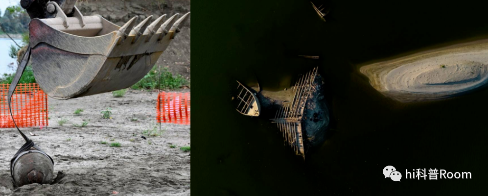 在意大利塞尔米德,由于水位下降,人们发现了一艘二战时期的沉船,以及沉落在河底的炸弹。