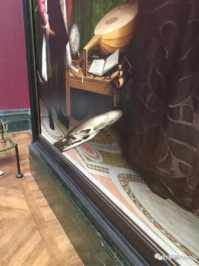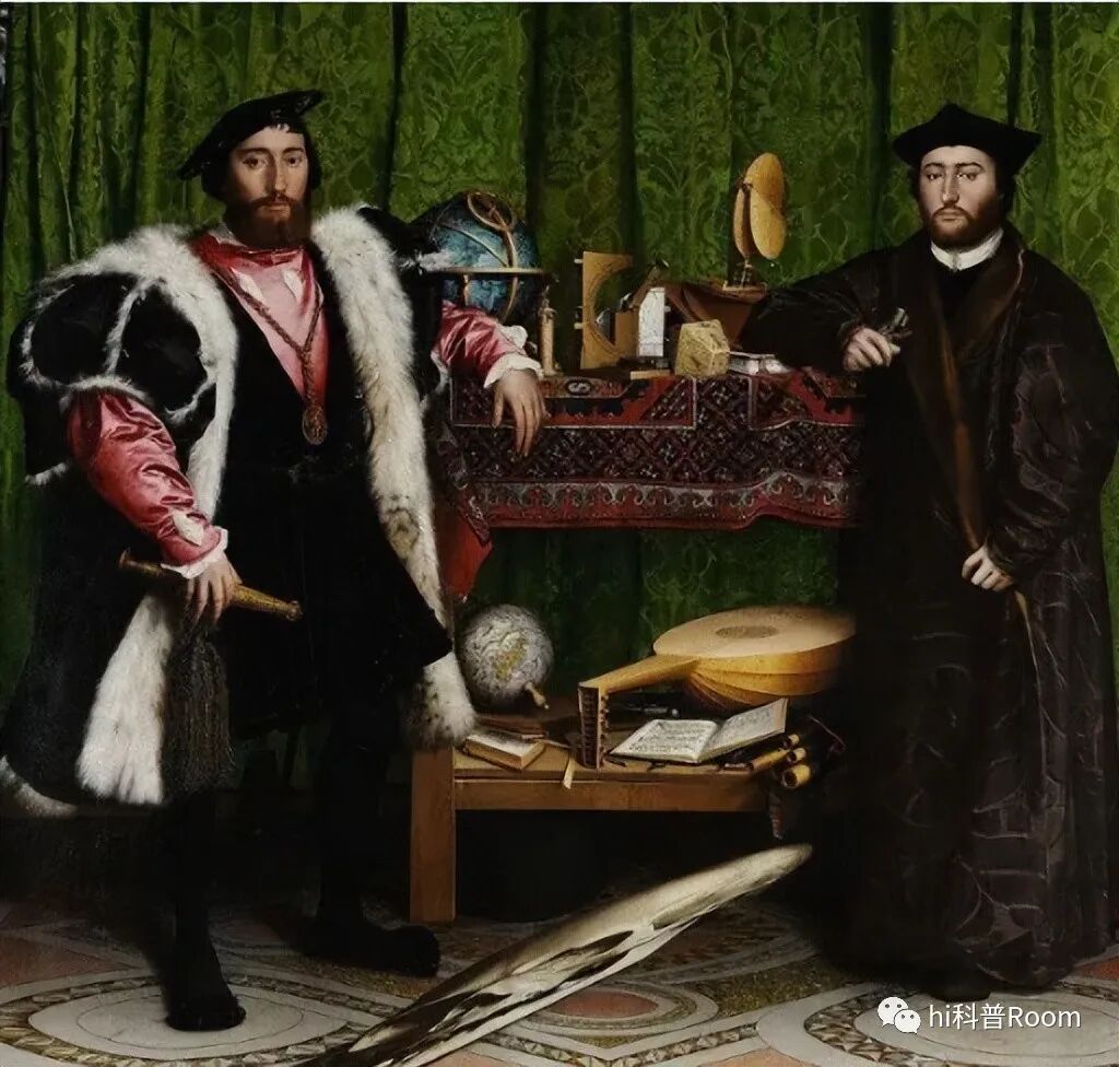 这幅画作中两个男人两位法国官员:让·德·丹特维勒(左边),亨利八世宫廷的外交官和他的朋友治·德·赛尔弗,年轻的拉沃城主教。活脱脱的人生赢家啊,背后摆放着各种高级“玩具”,有地球仪、六分仪等等航海装备,不过也在底下藏着一个死亡的象征-骷髅头。