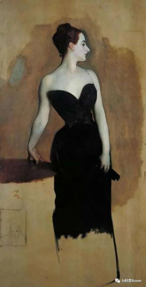约翰迫于无奈就想了一招,给摇摇欲坠的礼服上画了一条肩带,因为他太喜欢这幅作品了,费了不少心血,体现了他对美的理解。也能从他对多对次肩带的修改,以及对作品名称的“打码”,看出这位画家的内心是多挣扎。