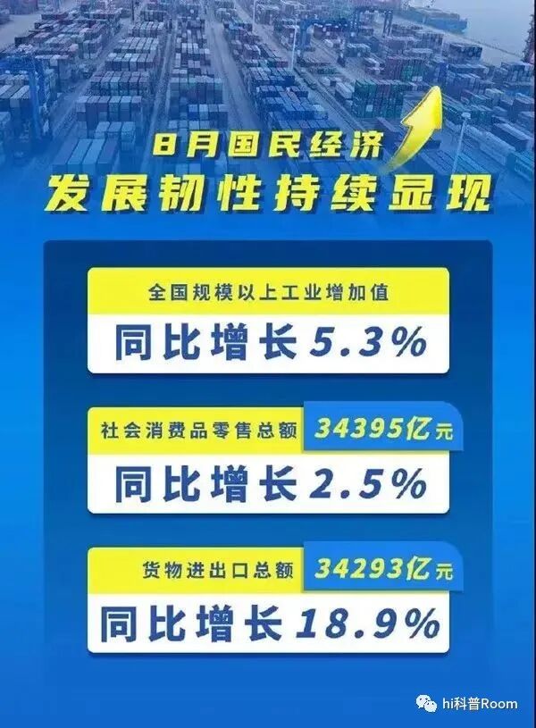 2022年8月国内规模以上的工业增加值,同比增长5.3%;社会消费品零售总额达到34395亿元,同比增长2.5%;货物进出口总额达到34293亿元,同比增长18.9%。、