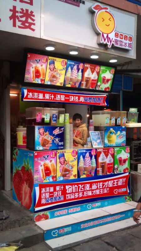 “那是一个只有两平方米左右的橱窗,进去最里面是一台冰柜,靠着窗口是一张桌子,桌子上面一台刨冰机......除掉这些设备之外,里面做产品的位置大概能站下两人。吊扇旁边挂着一个磁带随身听,随身听有一根线,连着一个声音特别大的音箱放着呼呼通通的流行音乐”。
