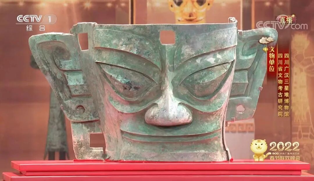 001号讲解员张国立与三星堆考古研究所所长为大家展示了三星堆重大考古发现——三星堆遗址3号坑出土的一件青铜大面具。