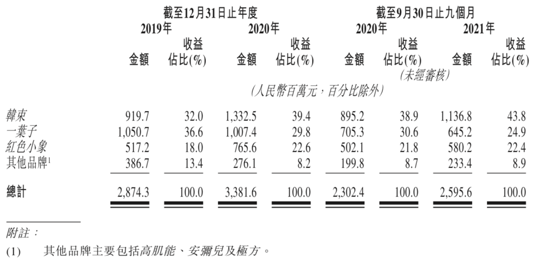 2019-2021年前三季度,韩束、一叶子、红色小象三个品牌贡献了近九成的收入。作为上美集团一直以来的主打产品,成立最早的韩束在2021年前三季度的营收占比高达43.8%,为11.36亿元,撑起了营收的半壁江山。