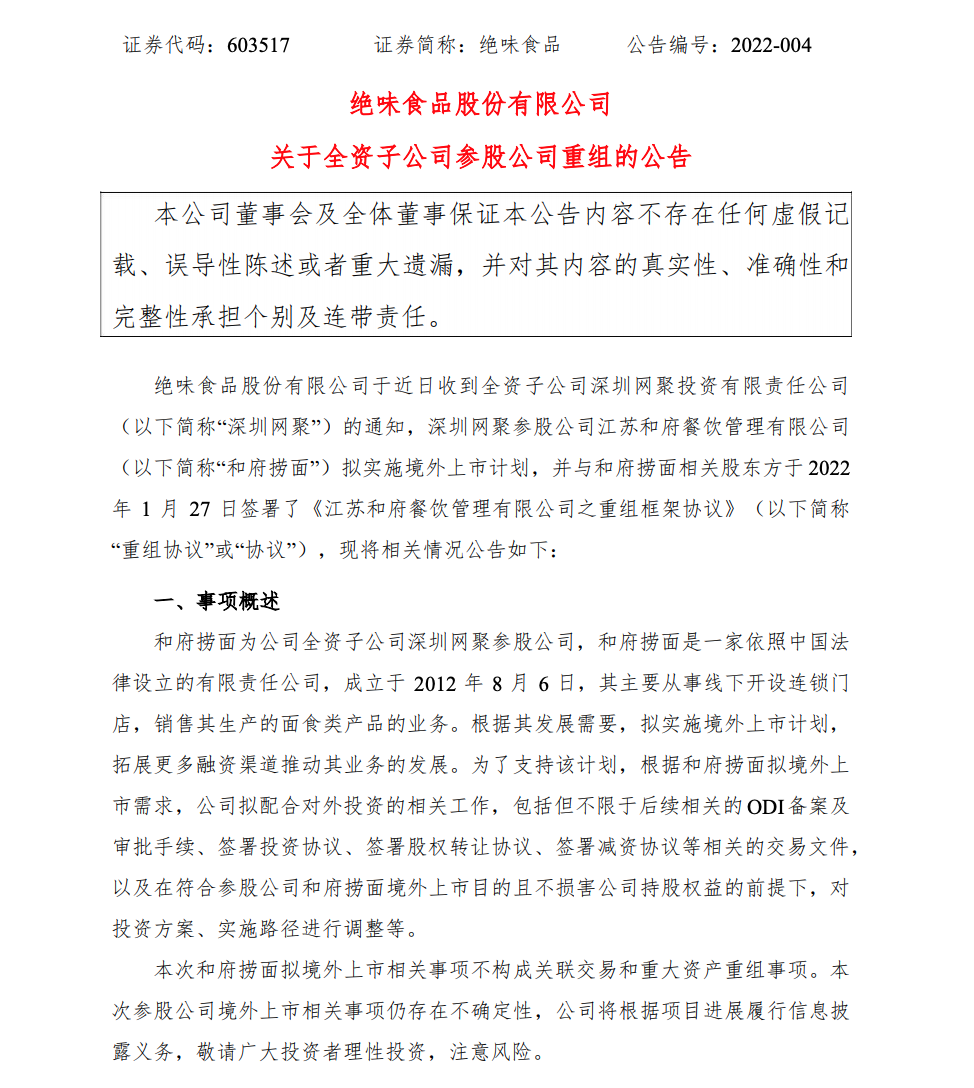 日前,绝味食品(SH:603517)发布公告称,该公司全资子公司深圳网聚投资有限责任公司(下称“深圳网聚”)参股的江苏和府餐饮管理有限公司(下称“和府捞面”)拟实施境外上市计划,和府捞面或将于今年冲刺港交所。