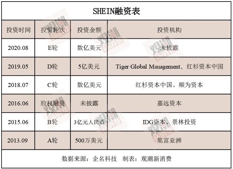 一系列的布局有足够的资本支撑,除自身的高额营收外,SHEIN曾完成多轮融资,股东名单中有多家明星资本。