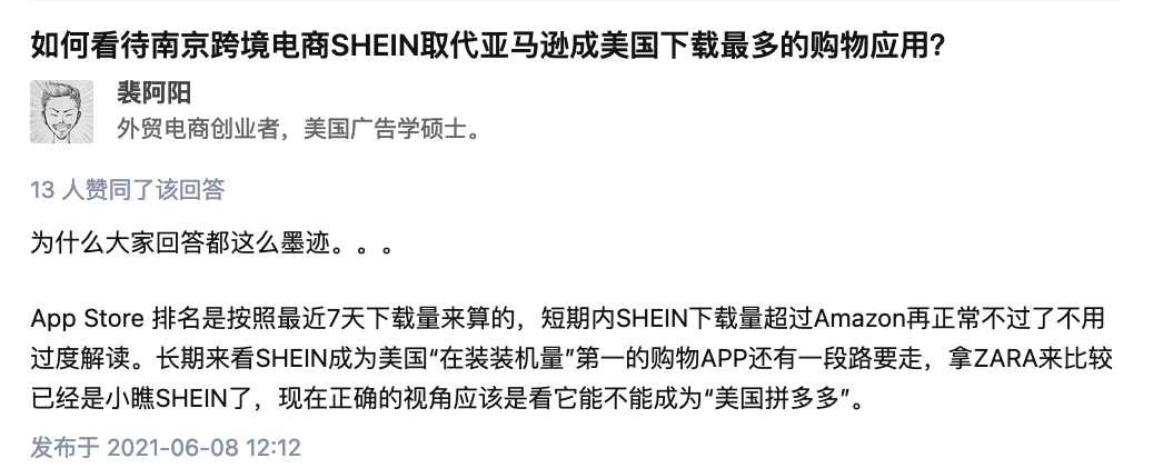 不过,“裴阿阳”并不同意这种观点,他在知乎的一篇回答中提到,拿Zara来比较已经是小瞧SHEIN了,现在正确的视角应该是看它能不能成为“美国拼多多”。