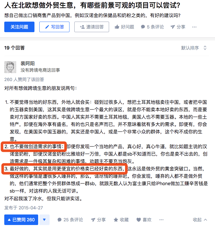 观潮新消费(ID:TideSight)在知乎上查询到一位名为“裴阿阳”的用户,曾多次回答跨境电商相关问题,言辞犀利,理解深刻而又独特。
