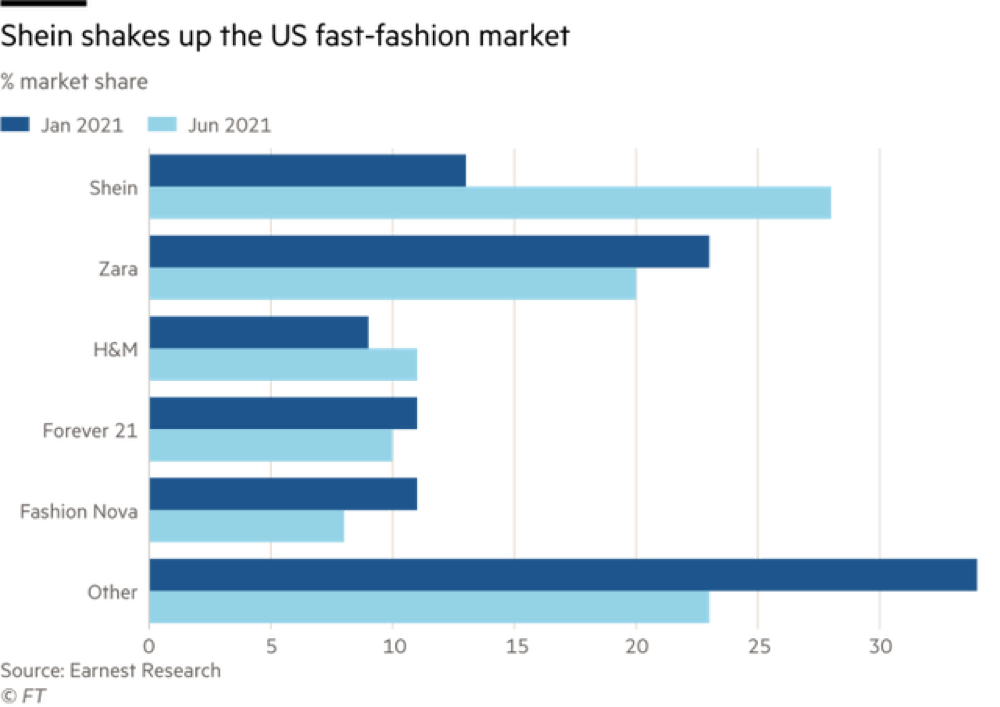 另据Earnest数据,2021年6月,SHEIN在美国快时尚市场的份额占比达到28%,同期Zara占比20%,H&M只有11%。