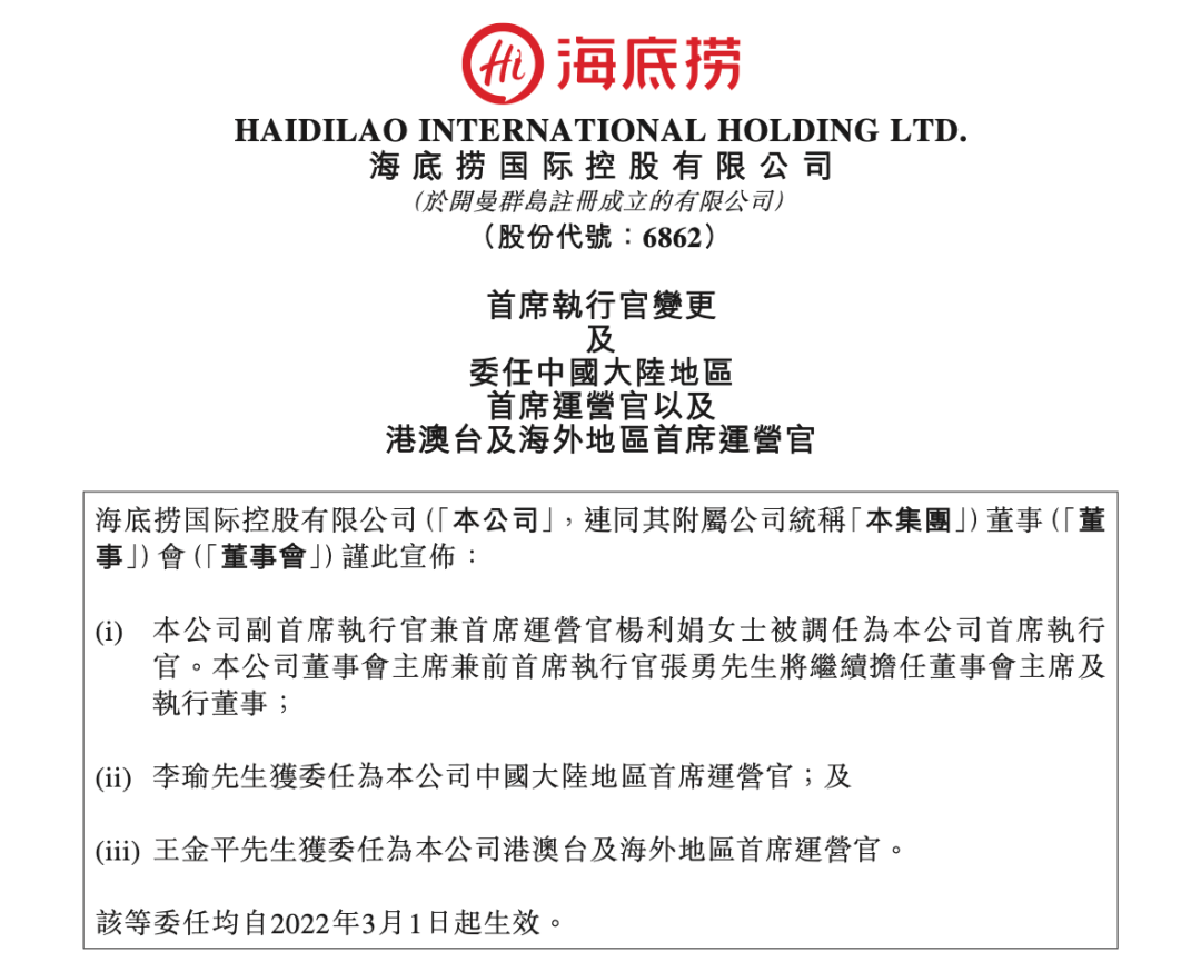 3月1日晚间,海底捞发布人事任命公告,杨利娟被调任为首席执行官,前首席执行官张勇将继续担任董事会主席及执行董事;两位80后高管:李瑜出任海底捞中国大陆地区首席运营官,王金平出任港澳台及海外地区首席运营官。