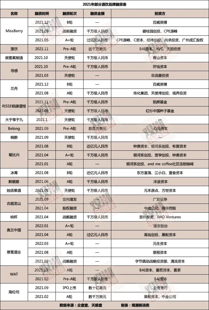 很快,创业公司嗅到了这一商机,赋比兴、江小白、兰舟、奥兰中国、醉鹅娘、贝瑞甜心等纷纷获得资本青睐。据不完全统计,2021年低度酒融资金额超10亿元。