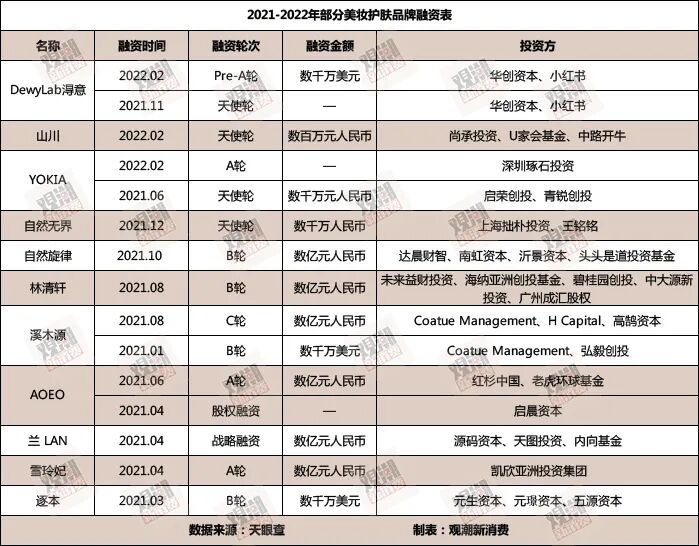 一年时间内,天然功效型护肤品牌—溪木源就完成了两轮融资,估值达到了近40亿元。此外,纯净护肤品牌蘭LAN在6个月内也连续完成两轮融资。天然植物护肤品牌YOKIA、雪玲妃、林清轩、自然无界等也都陆续拿到了融资。
