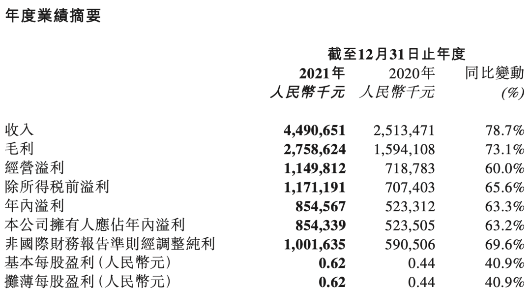 据财报显示,泡泡玛特2021年全年实现营收44.9亿元,同比增长78.7%;净利润 8.5亿元,同比增长63.3%;调整后净利润(非国际财务报告准则)为 10.02亿元,同比增长 69.6%。
