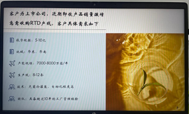 4月26日,据新浪财经独家报道,奈雪的茶近期因即饮产品销量大增,急需收购RTD(Ready To Drink,即饮饮品)产线,预计投资规模5到10亿元。据报道,某FA机构内部图片显示,其上市公司客户对于RTD产线的具体要求为:产能规模达到7000-8000万箱/年;生产线8-12条;技术要求无菌冷灌装、自动化程度高;团队具备超过10年工厂管理经验。