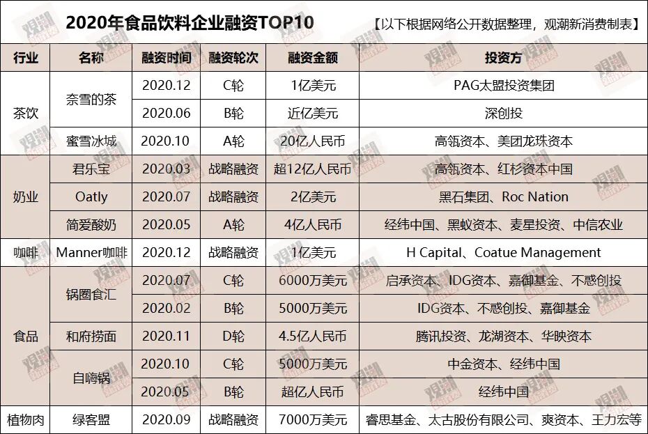 观潮新消费(ID:TideSight)根据公开信息整理出去年食品饮料融资TOP 10,蜜雪冰城、君乐宝、自嗨锅、简爱酸奶、Manner咖啡等,这10家企业融资总额近百亿元。