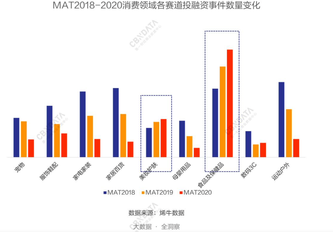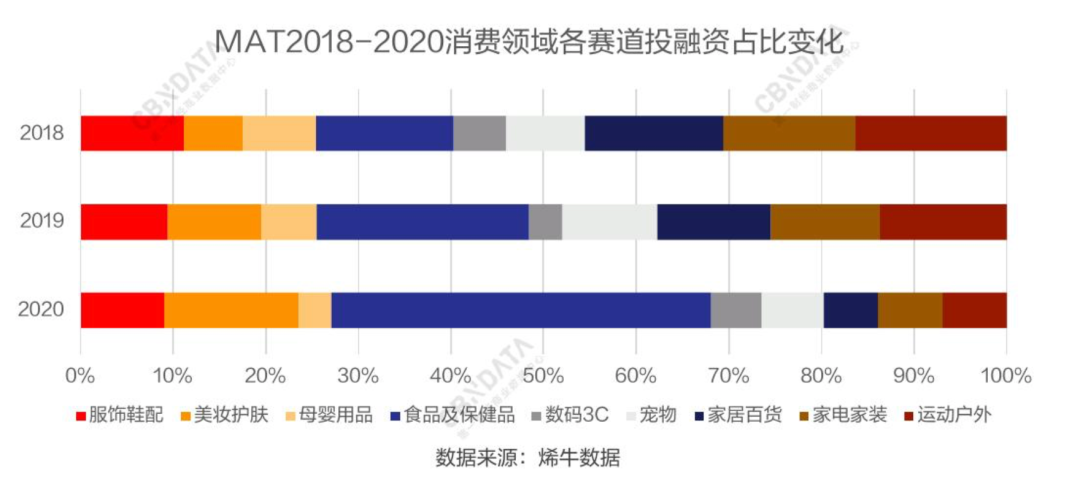 据《2020消费领域投融资趋势报告》显示,食品饮料及保健品行业,是近三年来消费领域创投市场占比最大的赛道。去年,整个消费领域投融资事件中,食品饮料及保健品赛道占了41%。