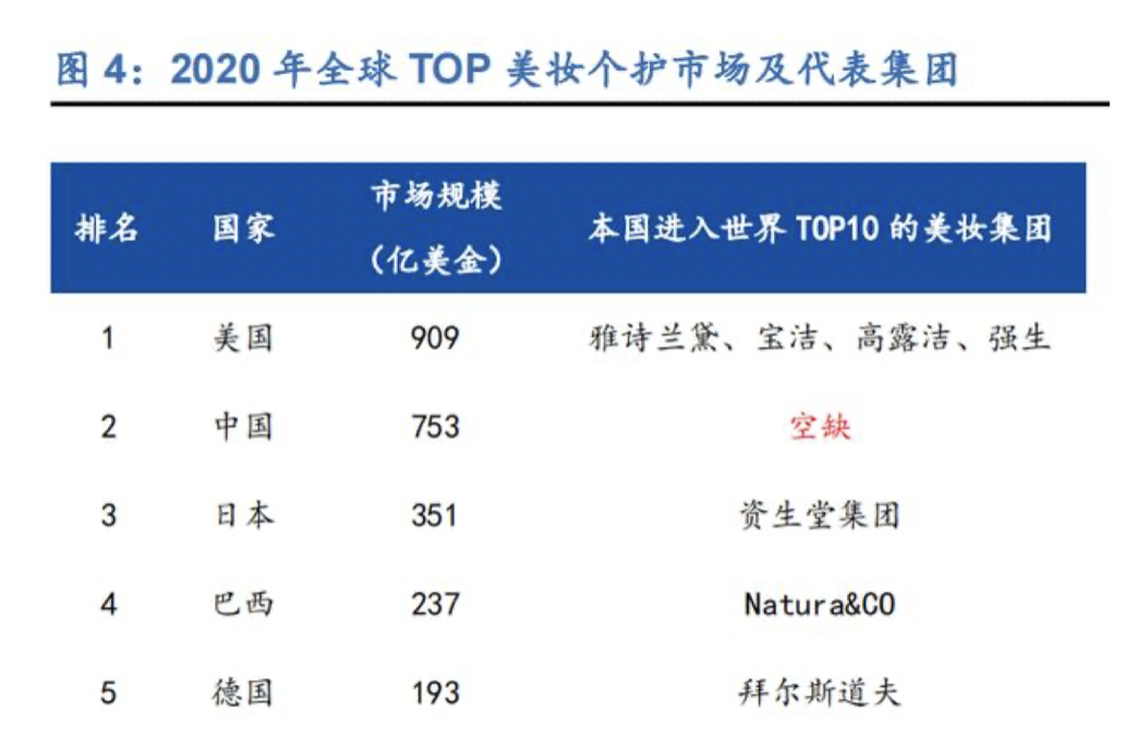 国元证券报告显示,美国、中国、日本、巴西、德国这世界前五的化妆品大国,除中国外,均产出了全球前十的美妆企业,而中国美妆赛道本土大企业一直处于空缺,虚位以待。
