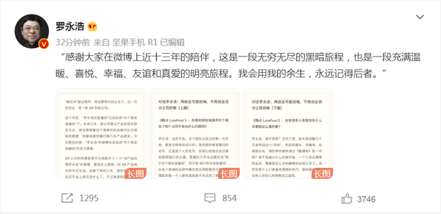 6月13日凌晨,罗永浩正式宣布“离开”交个朋友管理层,同时退出新浪微博等社交平台,未来几年原则上不会再接受媒体采访,罗永浩希望通过此举排除外界的干扰,“埋头从事下一代智能平台产品的研发”。同时,罗永浩个人新开#产品经理罗永浩#的微博,仅限业务相关的交流和辟谣。